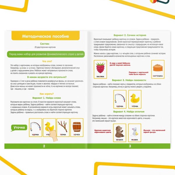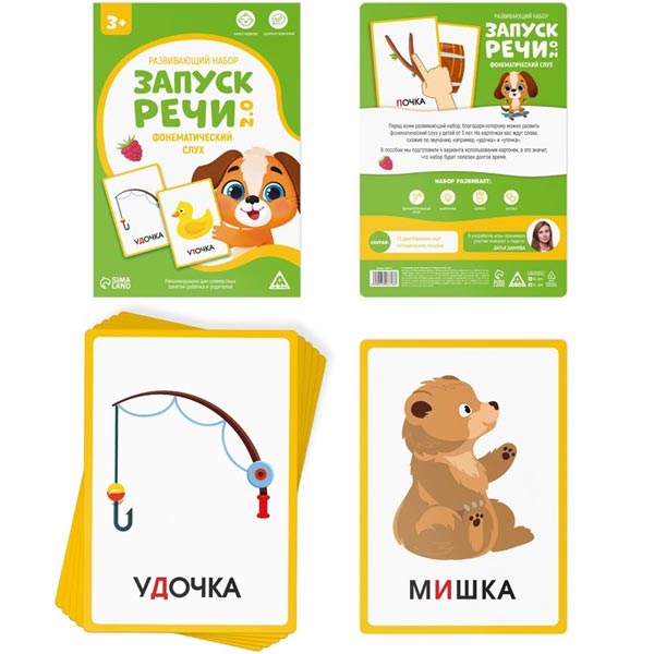Перед вами набор, благодаря которому можно усовершенствовать фонематический слух у детей от 3 лет. На карточках представлены слова, схожие по звучанию. Например "удочка" и "уточка". В пособии мы подготовили 4 варианта использования карточек, а это значит, что набор будет полезен долгое время.