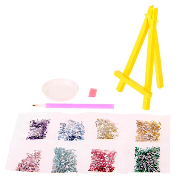 В наборе есть небольшой мольберт: с ним готовое творение можно расположить на полке или столе без дополнительных креплений. В таком интересном оформлении сверкающая картина будет выглядеть как предмет искусства.