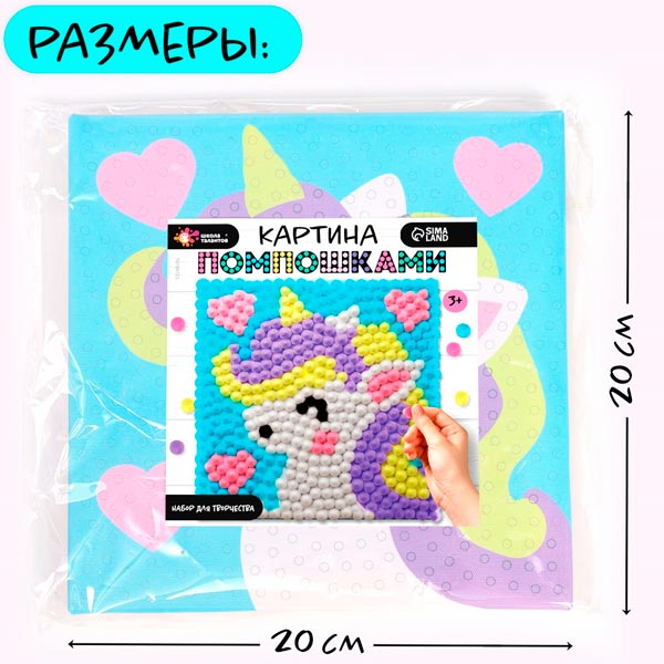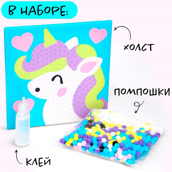 Набор для творчества "Единорог" — привлекательная и милая аппликация на холсте, которую нужно создать с помощью помпонов. Мягкие помпончики и необычные сюжеты аппликаций сделают творческое занятие незабываемым.