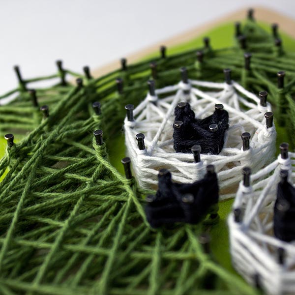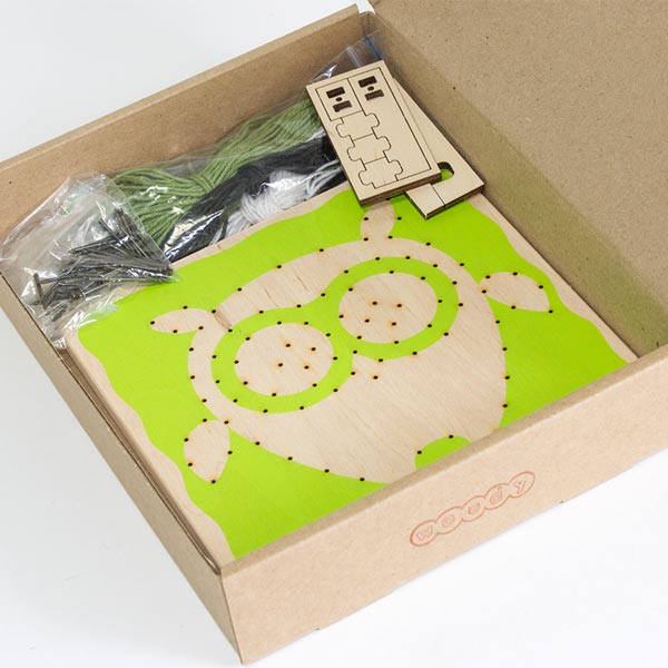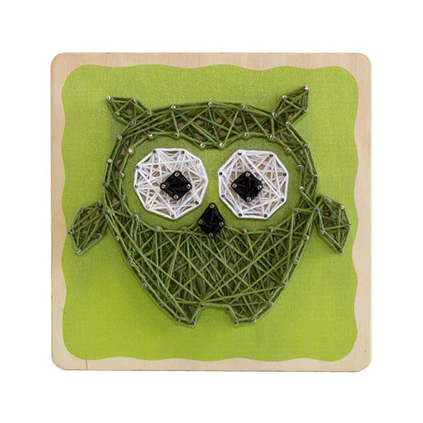 Следуя инструкции на упаковке, необходимо набить гвоздики по намеченным точкам деревянной основы с помощью безопасного держателя, завязать узелок на любом из гвоздиков. Затем обвязать все гвоздики по периметру у самой основы и заполнить получившийся контур, согласно образцу. И завершающий шаг — обвязать еще раз все гвоздики по периметру. И вы будете удивлены, как волшебным образом появляется уникальное произведение искусства, которое восхищает изысканной простотой и необычным внешним видом.