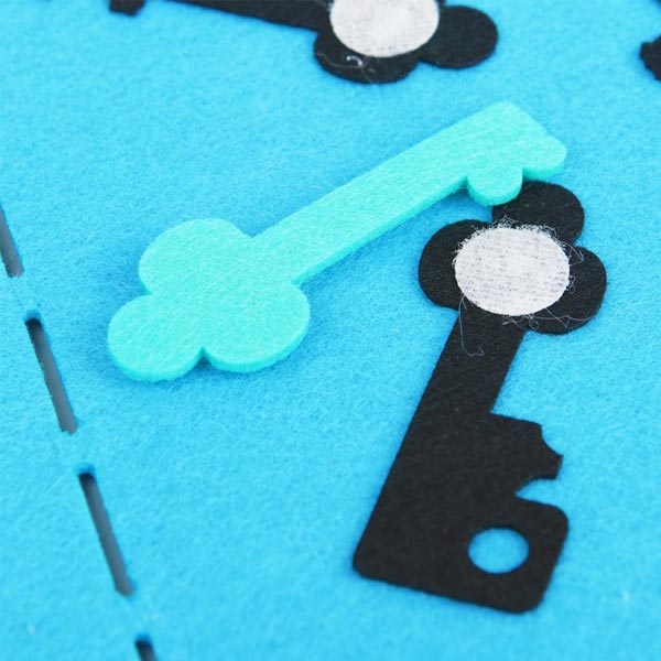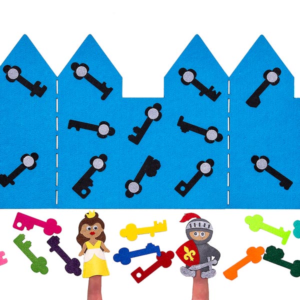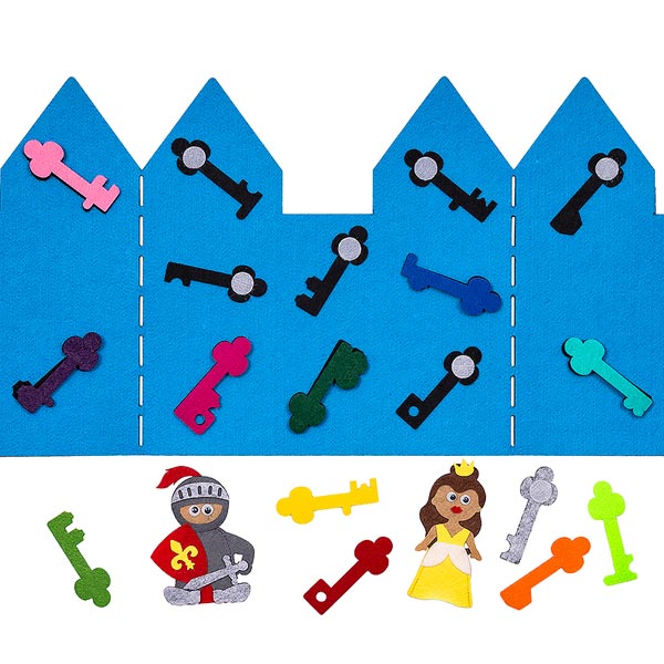 Игра сделана в виде книжки-замка, раскрыв которую, ребёнок может помочь рыцарю спасти принцессу, подобрав ключики. На поле из фетра изображены тени ключиков, к которым нужно подобрать цветной ключик - пару.
