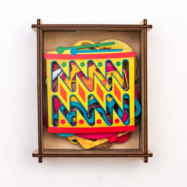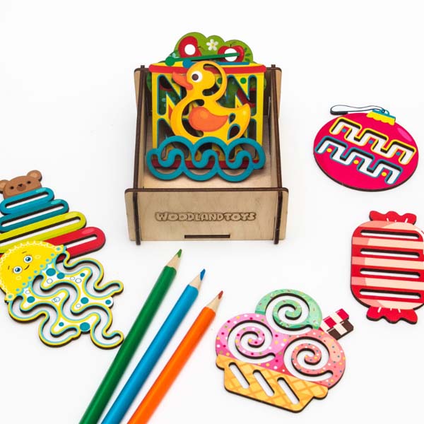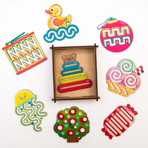 В деревянной коробочке ребенок найдет восемь красочных квадратных трафаретов с узорными прорезями. Занятия с линейками очень просты - ребенок может проводить по прорезям пальчиками или любыми пишущими принадлежностями.